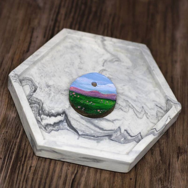 A bright coloured landscape. The mountains and pink flowers are glow in the dark.
