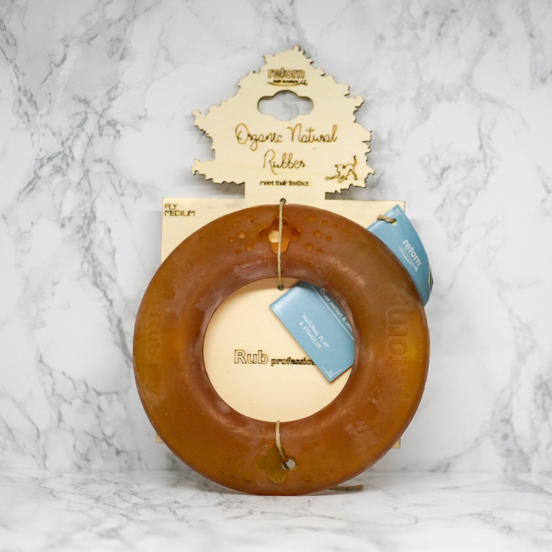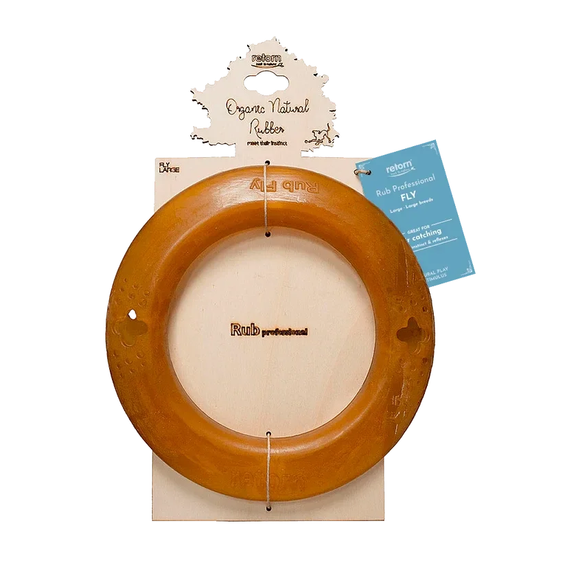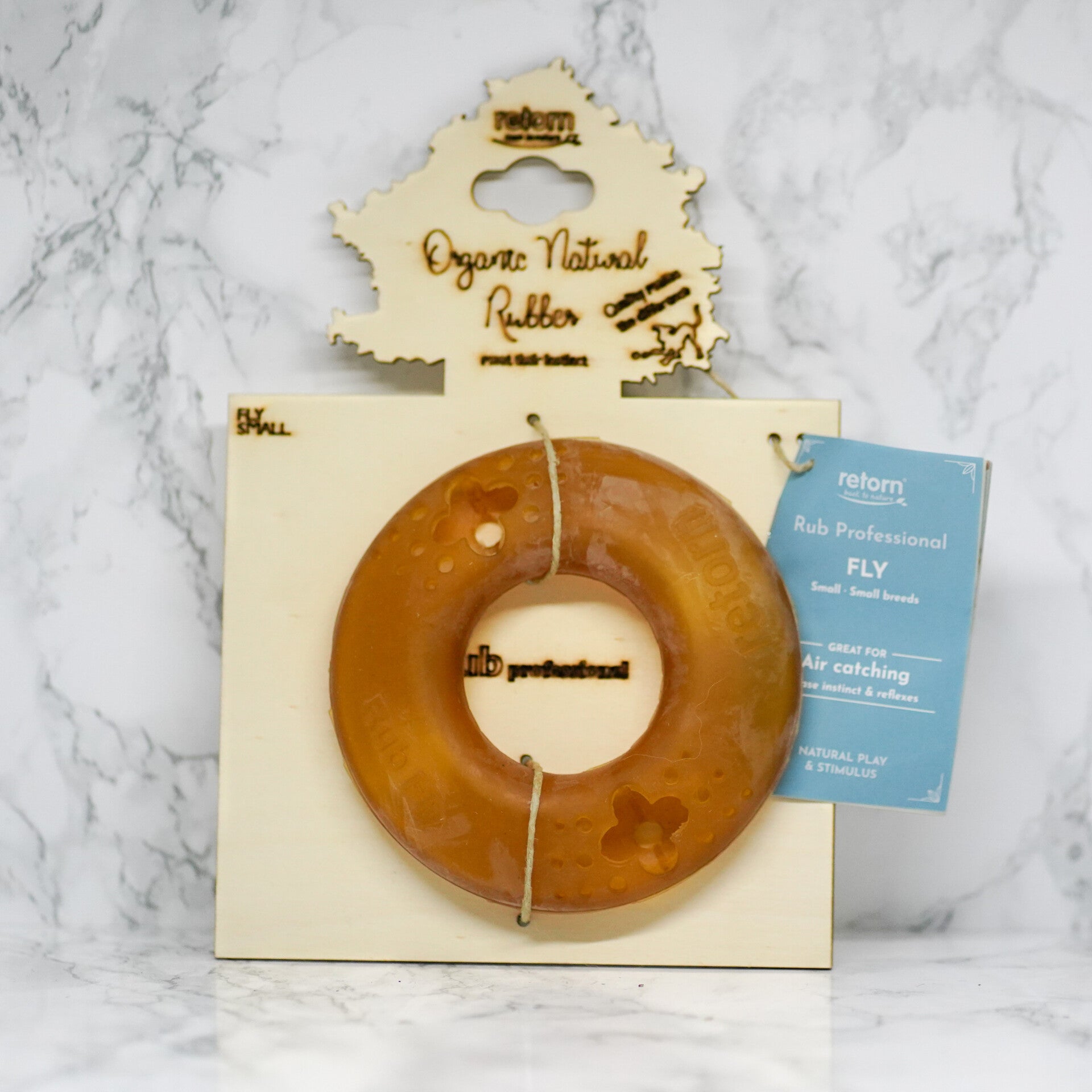 Retorn is een Spaans merk. De Rub Fly is gemaakt van 100% organische, natuurlijke hars. De Fly is een leuk gooi en verrijkingsspeeltje. Je kunt er traktaties in stoppen voor extra speelplezier. De Rub Fly is zacht voor de tanden en zeer flexibel.