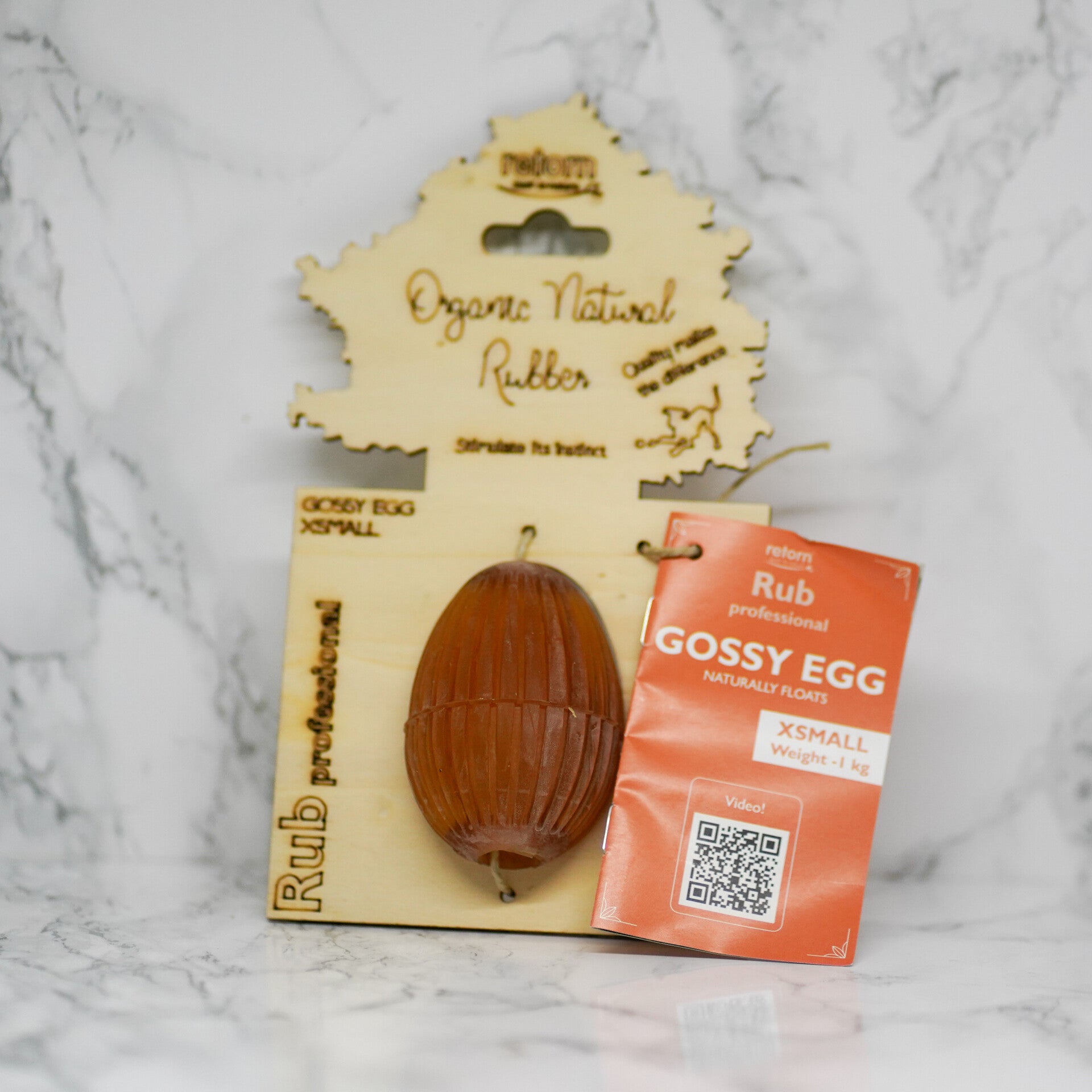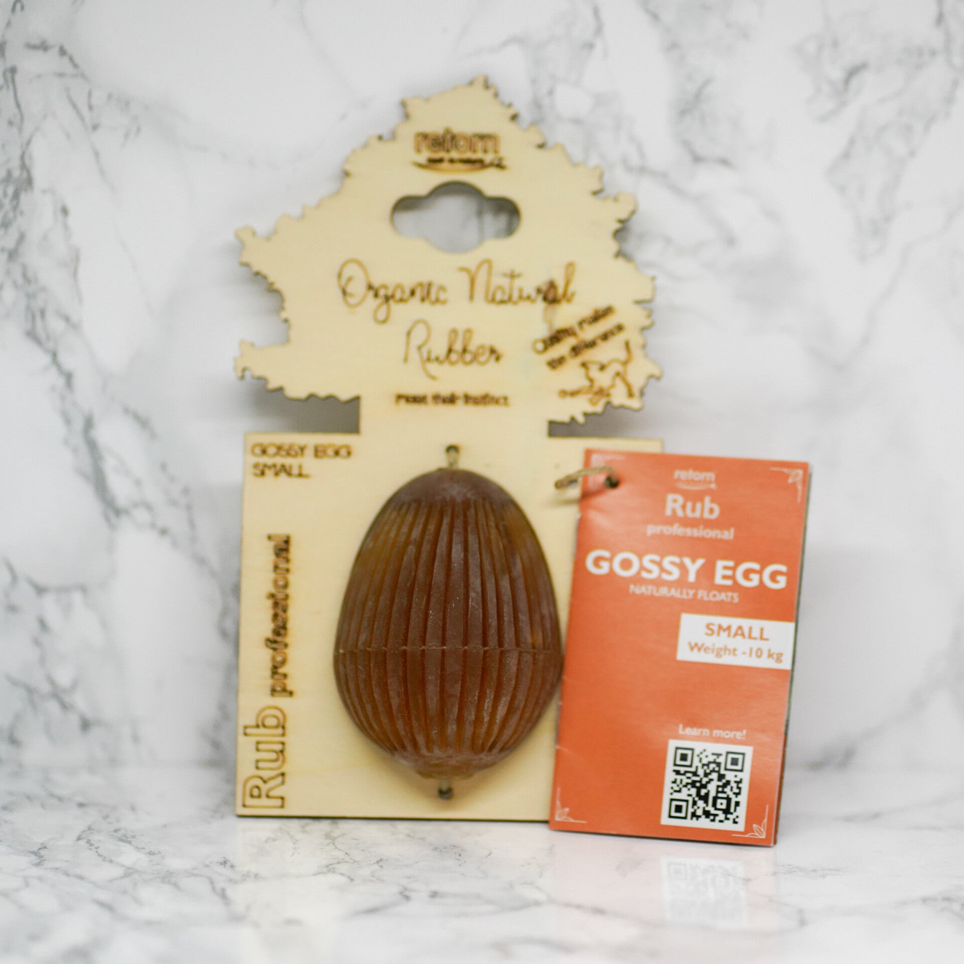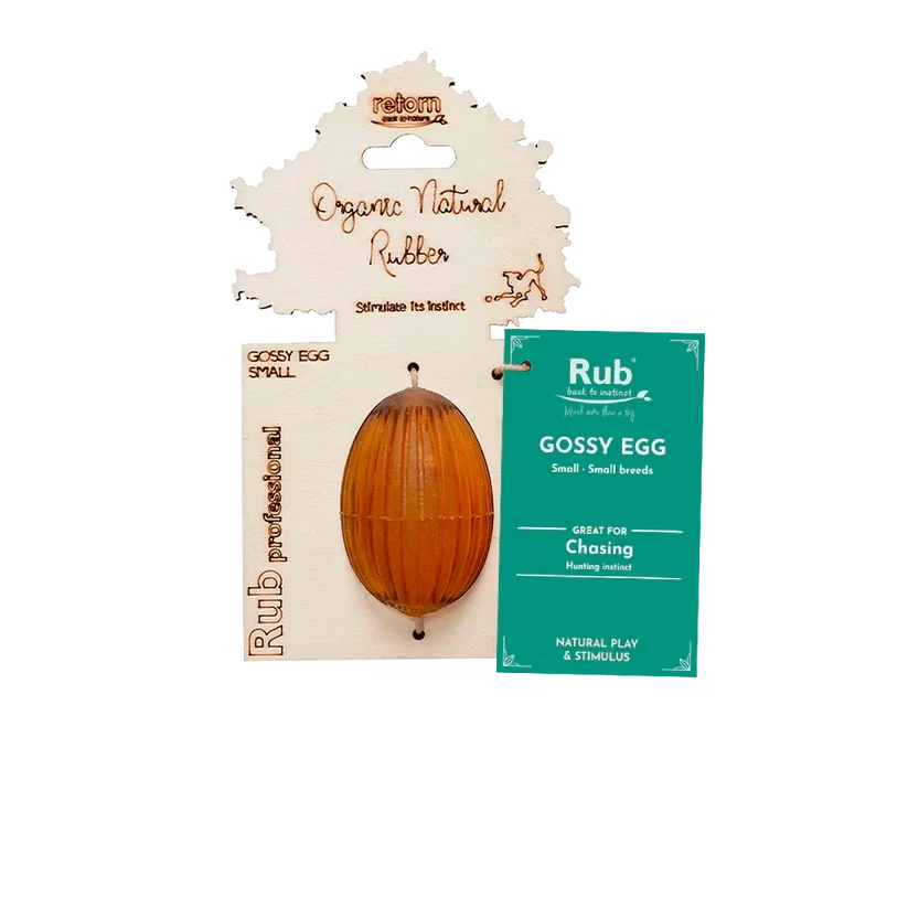 Retorn is een Spaans merk. De Rub Gossy Egg is gemaakt van 100% organische, natuurlijke hars. De Egg is een leuk kauw- en verrijkingsspeeltje. Je kunt er traktaties in stoppen voor extra speelplezier. De Gossy Egg is zacht voor de tanden en zeer flexibel.