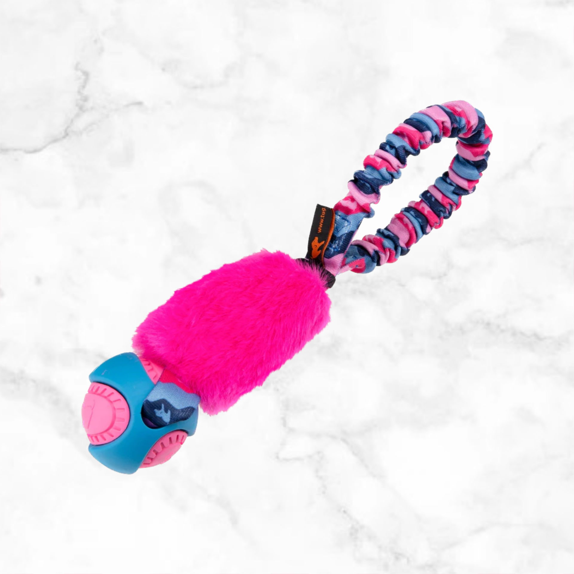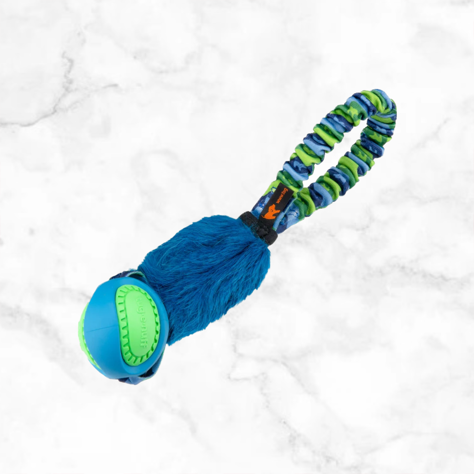De Pocket PowerBall Fauxtastic Tug beschikt over een bungee, deze dempt de schokken bij het trekken. Hiermee is hij extra comfortabel en veilig voor de nek van de hond en je eigen schouder. Ook is er een blauwe kleur in het ontwerp verwerkt, honden kunnen deze kleur beter zien.