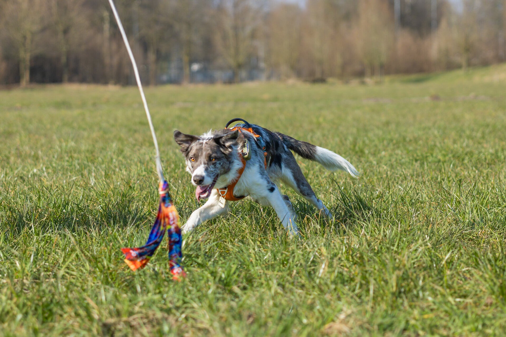 Speeltijd: Beweeg de flirtpole in verschillende richtingen en varieer in snelheid om je hond uit te dagen. Zorg dat hij af en toe het lokaas kan vangen om frustratie te voorkomen. De flirtpole is geen trekspel, speel dus “catch and release”.