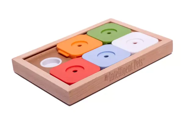 De Sudoku Medium Advanced is een geweldige manier om je hond mentaal te verrijken. Dit houten spel heeft vijf kleurrijke schuifstukjes die verplaatst kunnen worden om traktaties eronder te vinden.