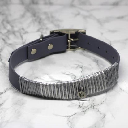 A 38-45 centimeter grey collar made from 25mm biothane with decorative silver and white cord and silver hardware.