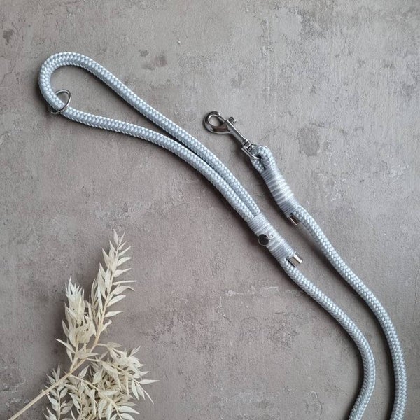 A 1.70 meter grey/silver leash made from (+-10mm) PPM with white details and silver hardware.