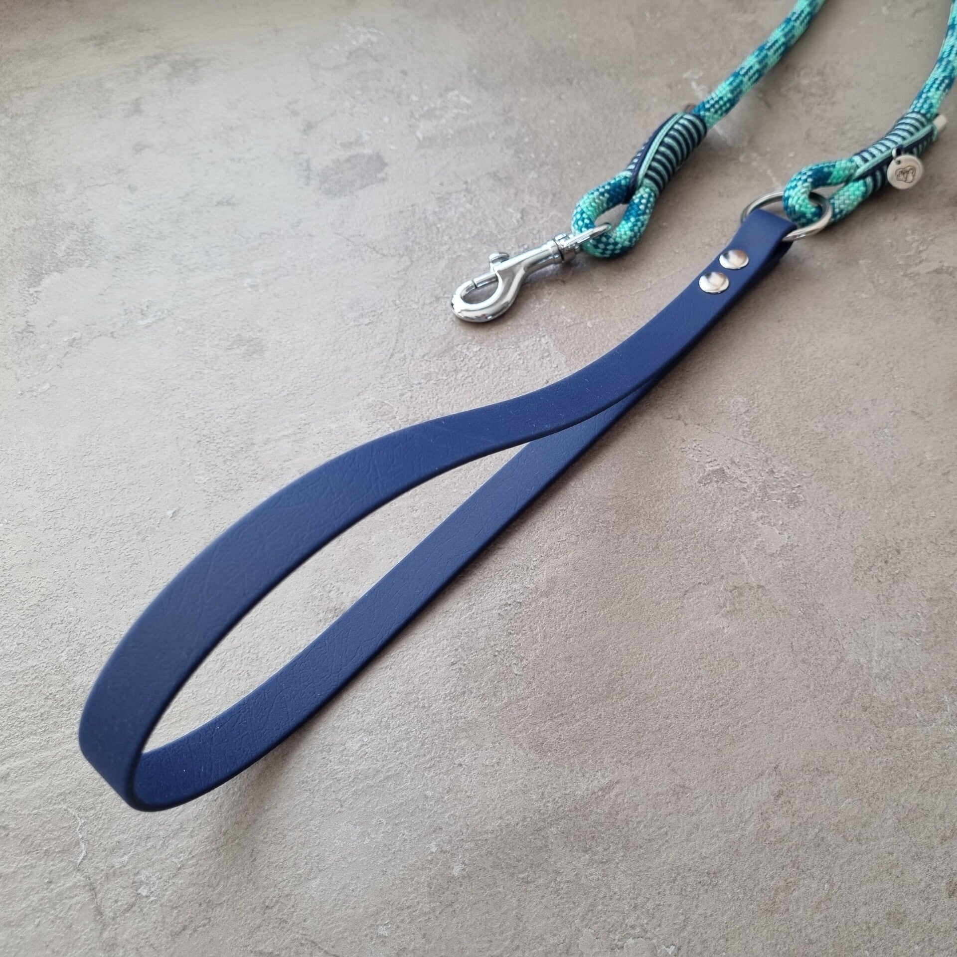 A 1.85 meter aqua blue leash made from (+-8mm) ppm rope with a dark blue 16mm biothane handle and silver hardware.