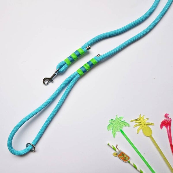 A 1.60 meter bright blue (+-10mm) PPM leash with green details and silver hardware.
