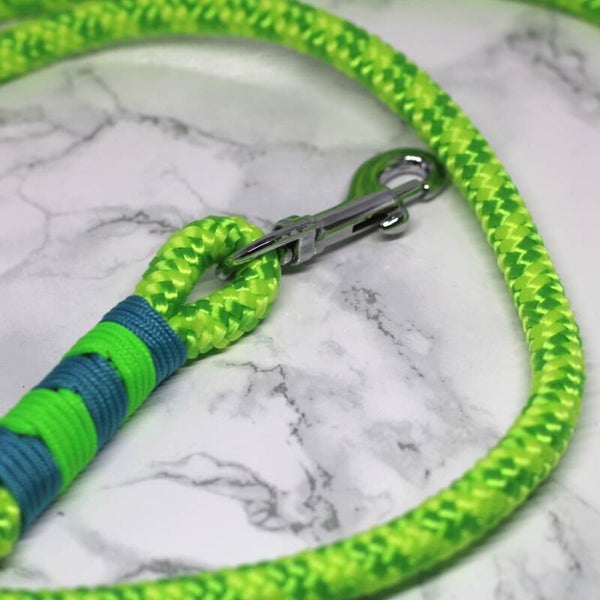 A 1.60 meter Green mixed colored leash made from (+-10mm) PPM with blue details and silver hardware.