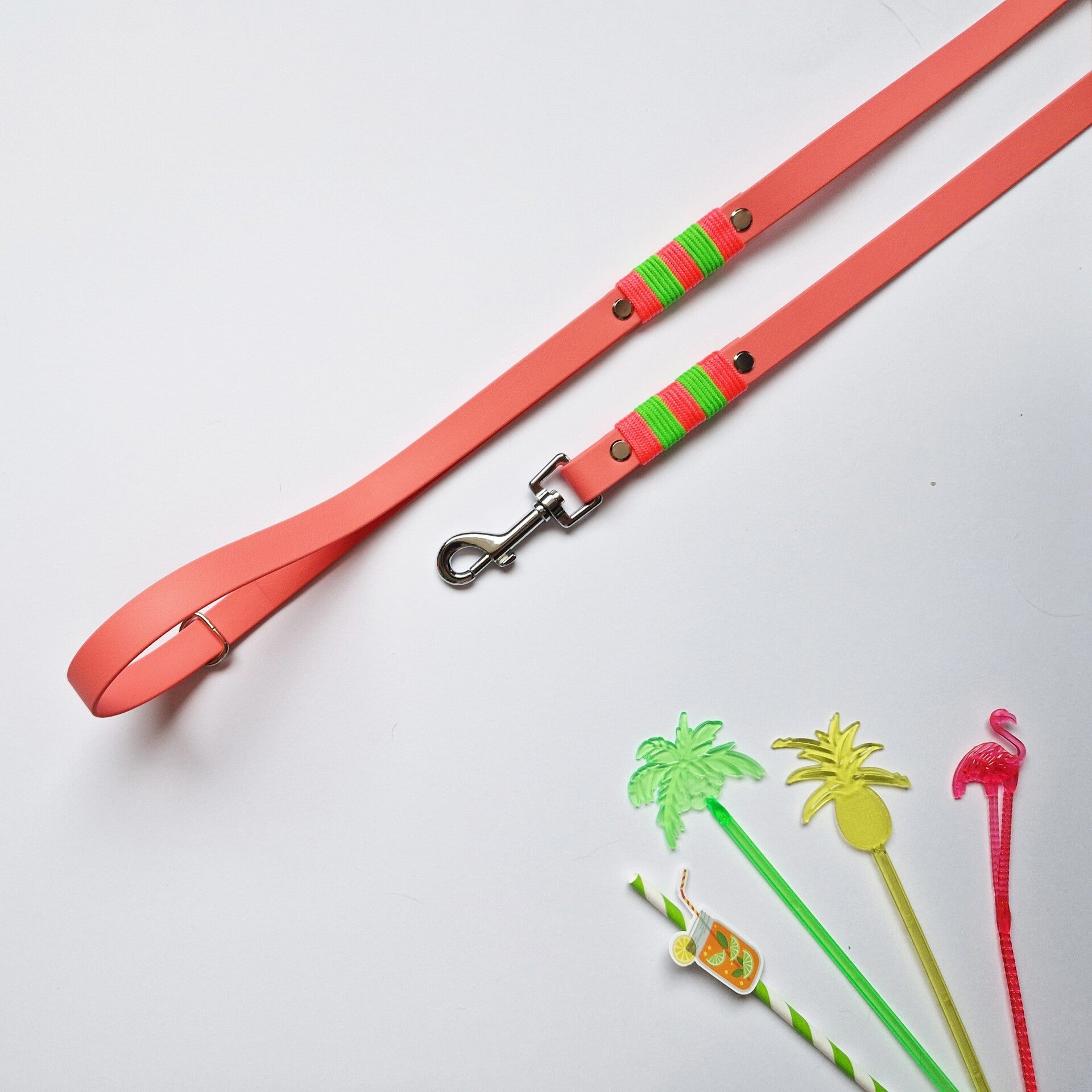 A 1.60 meter pink leash made from 19mm biothane with green details and silver hardware.