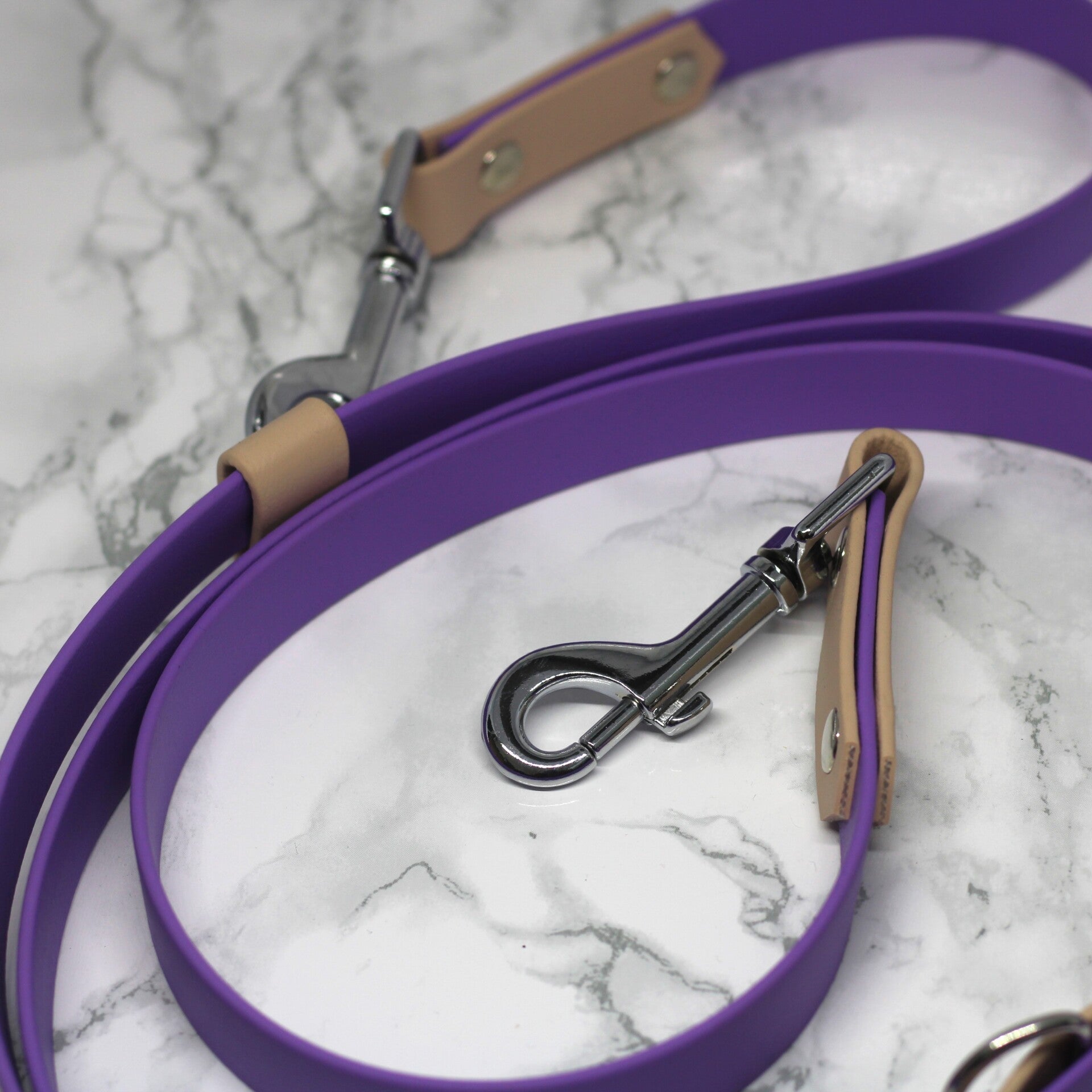 An adjustable purple leash made from 19mm biothane with nude details and silver hardware. The leash can be adjusted from 1.35 to 1.85 meter.