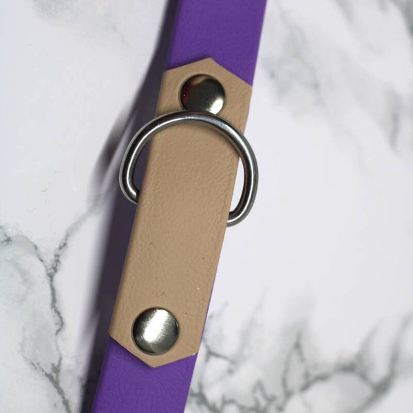 A 35-41 centimeter purple collar with nude details made from 19mm biothane and silver hardware.