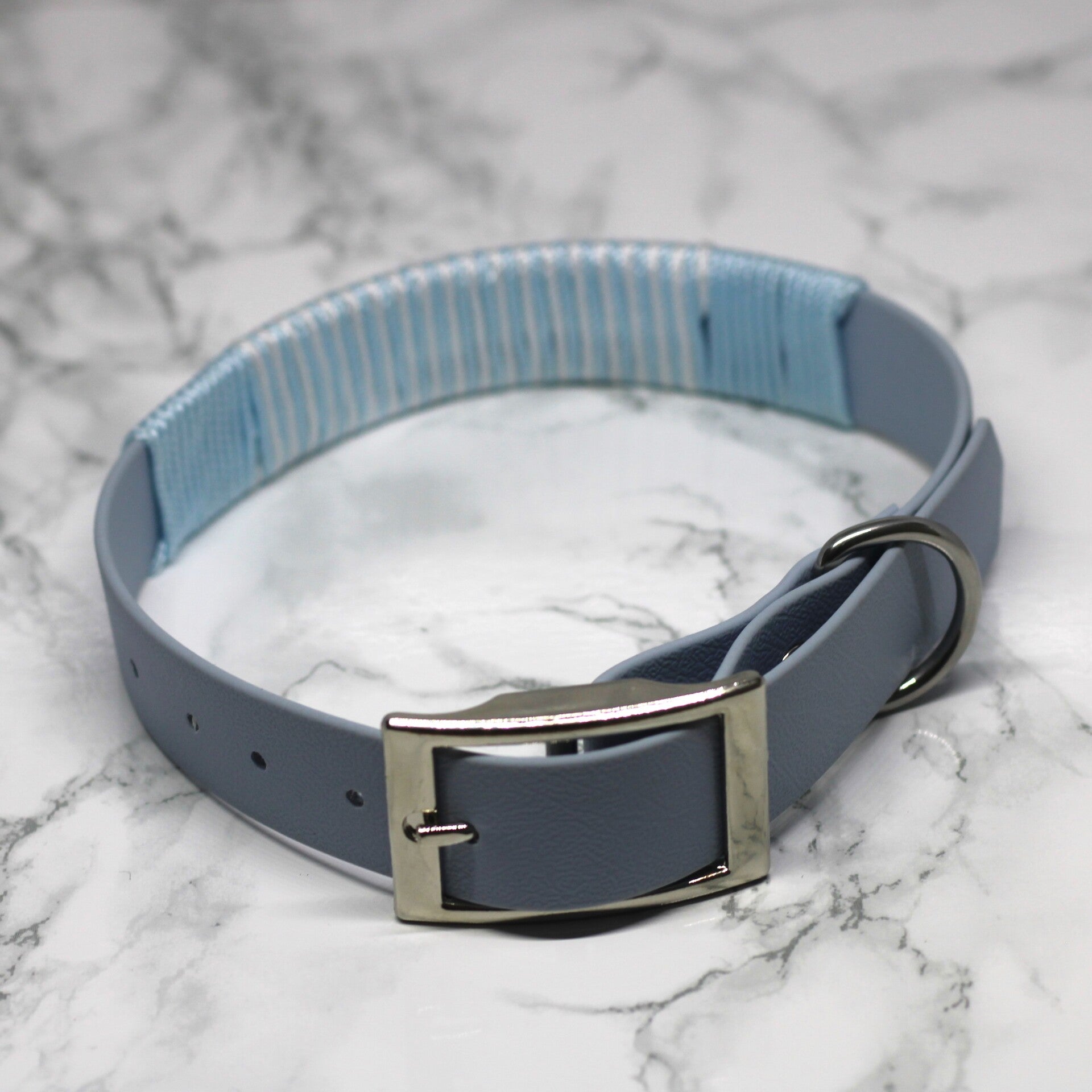 A 38-45 centimeter pastel blue collar made from 25mm biothane with decorative white and pastel blue cord and silver hardware.