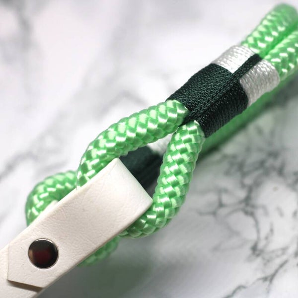 A 43-47 centimeter white collar made from 19mm biothane combined with green ppm rope, white details and silver hardware.