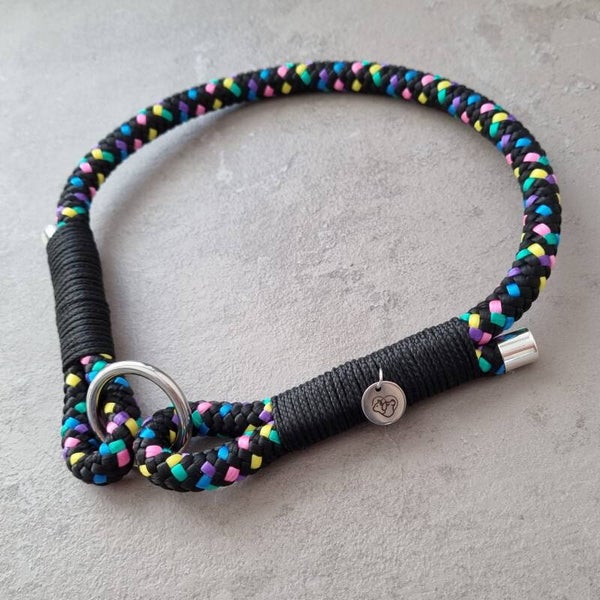 A 47 centimeter black mixed ID collar made from (+-10mm) ppm with black cord and silver hardware.